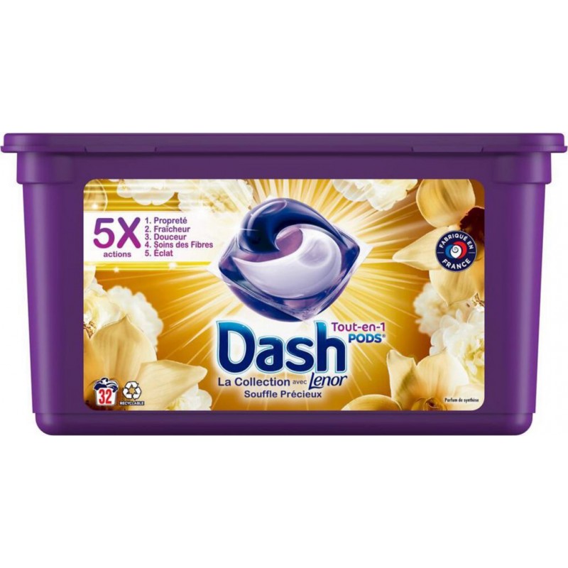 DASH PODS SOUF PREC 32D LAVAGE DU LINGE LESSIVES. >,30% Agents De Surface Anioniques, 5-15% Savon, <,5% Agents De Surface Non Ioniques, Phosphonates, Enzymes, Azurants Optiques, Parfums, Benzyl Salicylate, Citronellol, Coumarin, Limonene, Linalool. Produit unitaire EAN 8006540550335.
